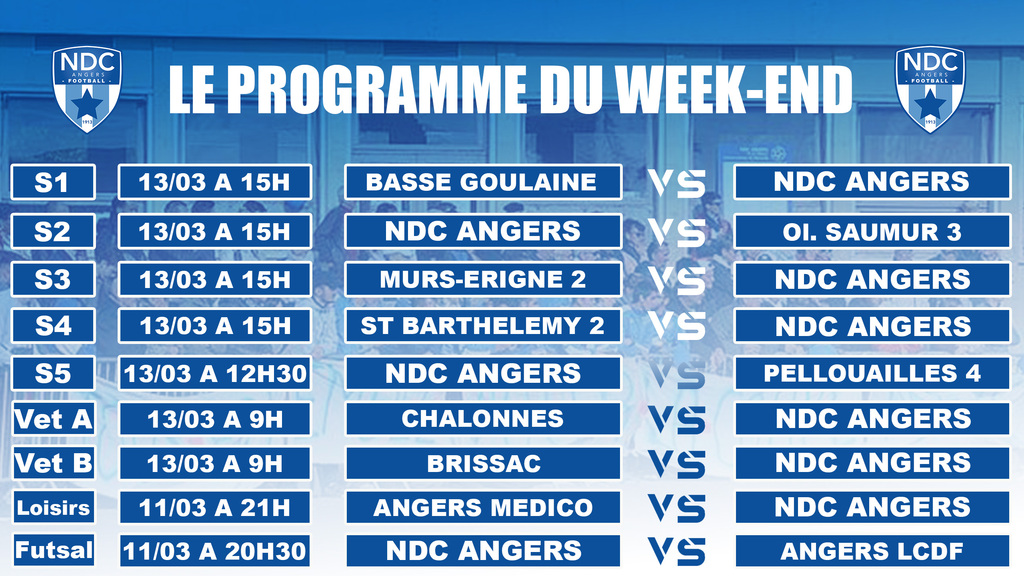 Dimanche, en levée de rideau de l'équipe fanion, les seniors 5 seront délocalisés à Marcel Nauleau pour leur rencontre face à Pellouailles Corzé 4. Il restera donc nos seniors féminines qui joueuront à 13h face à Bouchemaine. Contre à une équipe qu'elles avaient battu de justesse en première phase, 4 buts à 3 fin novembre, les joueuses de William Le Dantec auront à coeur de finir le match avec une victoire afin d'enchaîner avec un quatrième succès en autant de rencontres.