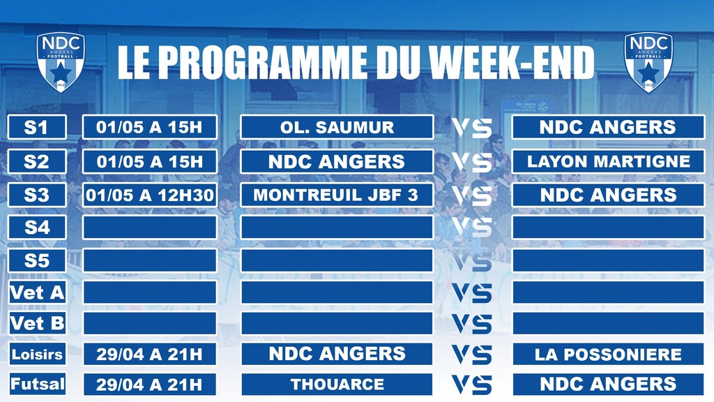 Samedi, la journée sera chargée sur le complexe André Bertin. En effet, dix équipes du club disputeront leur rencontre à domicile. De 10h à 19h, il y aura du football sur le complexe mais aussi à Marcel Nauleau et au stade Paul Robin. Les U14 de Cyprien Boulday joueront leur rencontre de championnat face au Cholet FC au stade Marcel Nauleau, tandis que les U15B de Bastien Nicolas recevront l'US Beaufort en Challenge de district au stade Paul Robin.