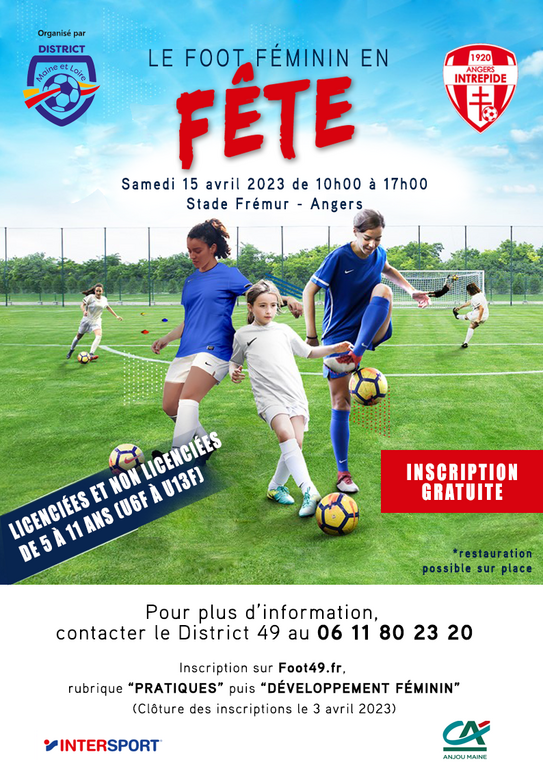 Manifestation foot 100% féminin organisée par le District de Football du Maine et Loire. Pour les jeunes filles de 5 à 13 ans (U6F aux U13F). Cette année, le foot féminin en fête aura lieu sur le complexe de l'Intrépide d'Angers (Rue des Chaffauds, 49000 Angers). Cette journée festive est entièrement gratuite.