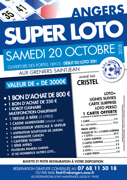 Le Super Loto de NDC Angers football se déroule le samedi 20 octobre aux Greniers St-Jean à 20 heures. Réservation gratuite conseillée.