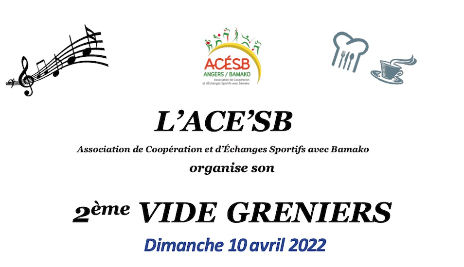 Membre de l'association, NDC vous invite à participer au vide-greniers organisé par l'ACE'SB. De 7h30 à 18h, sur l'esplanade du parc de loisirs du Lac de Maine, se tiendra la 2e édition de ce vide-greniers dont tous les bénéfices serviront au développement de projets sportifs entre Angers et Bamako.