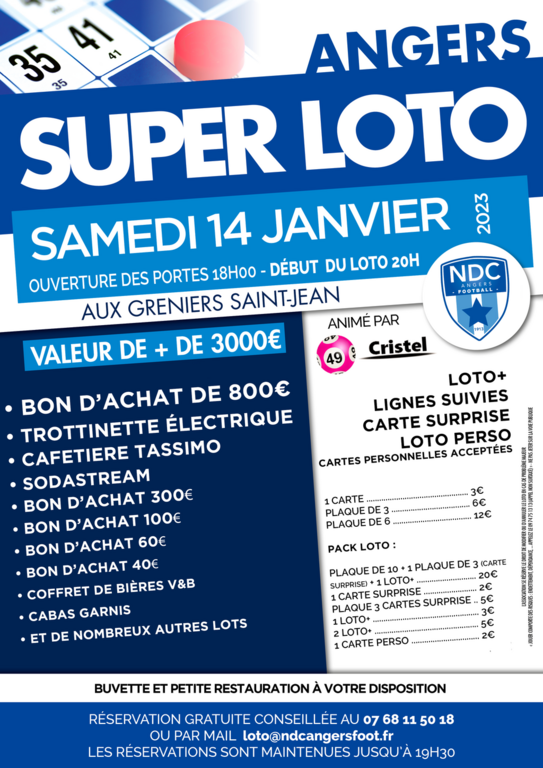 Réservation gratuite conseillée au 07.68.11.50.18 ou par mail loto@ndcangersfoot.fr