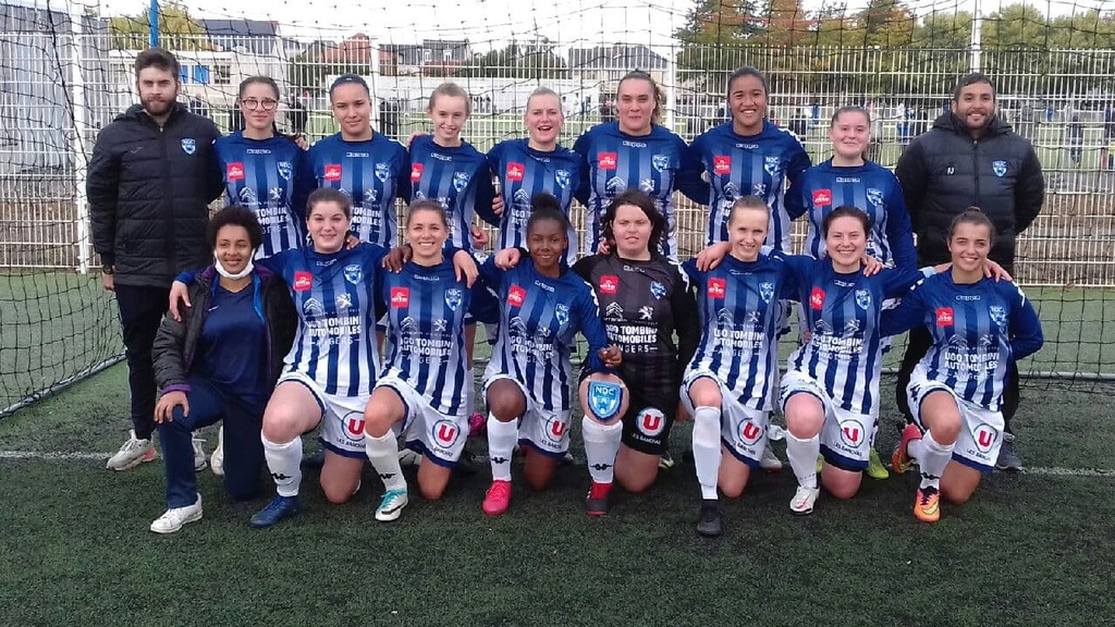 Les bleues et blanches abordaient leur rencontre dans la bonne humeur. Juste avant, et sous le déluge, elles chantaient à 5 minutes avant le coup d'envoi. Les Ndcéennes débutent la partie par une phase d'observation, Ernee étant une equipe de niveau régional inconnue pour les locales. Pour autant, ce sont bien les joueuses de William Le Dantec qui poussent en première période sous les encouragements des supporters. Après seulement 3 minutes de jeu, Kamilya Allam ouvrait le score mais son but était refusé pour une position de hors jeu. Dans la foulée Calista Zaldivar déboulait côté gauche pour adresser une passe dans la surface à Safiya Abdelsselam qui manquait sa tentative devant le but vide. C'est tout logiquement que NDC finit par ouvrir le score sur un exploit individuel de Kamilya Allam, qui, après avoir dribblé 3 joueuses, lobait la gardienne à bout portant. (1-0, 11e). Les bleues se laissaient distraire, la minute suivante, elles encaissaient un but sur corner par manque de concentration. Sur un coup franc aux abords de la surface, Kamilya Allam prenait ses responsabilités et envoyait une frappe dans la lucarne adverse pour remettre les siennes devant au tableau d'affichage. Alors que les visiteuses subissaient, elles trouvaient les ressources pour égaliser à nouveau, profitant d'un cafouillage dans la surface angevine pour tromper Elodie Fronteau (2-2, 30e). Les coéquipières de Léonie Cousseau, capitaine, ne baissaient pas la tête. Dounia Emry à peine entrée en jeu, récupérait le ballon aux abords de la surface mais voyait sa frappe finir a quelques centimètres du poteau adverse. Kamilya Allam lancait Safiya Abdesselam sur son côté droit, cette dernière prenait le meilleur sur son défenseur et d'une frappe excentrée venait inscrire le but du 3-2 bien aidé par la gardienne ernéenne.