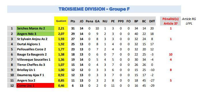 Le district de Maine-et-Loire a officialisé les classements départementaux ce jeudi 14 mai. L'équipe des seniors 3 accède à la division 2, après trois saisons passées en D3. Bravo au coach Pascal Fusillier, son adjoint Cyril Froger, à leurs dirigeants Christophe Lévêque et Michel Clavreul et tous leurs joueurs. C'est une belle récompense pour le club.