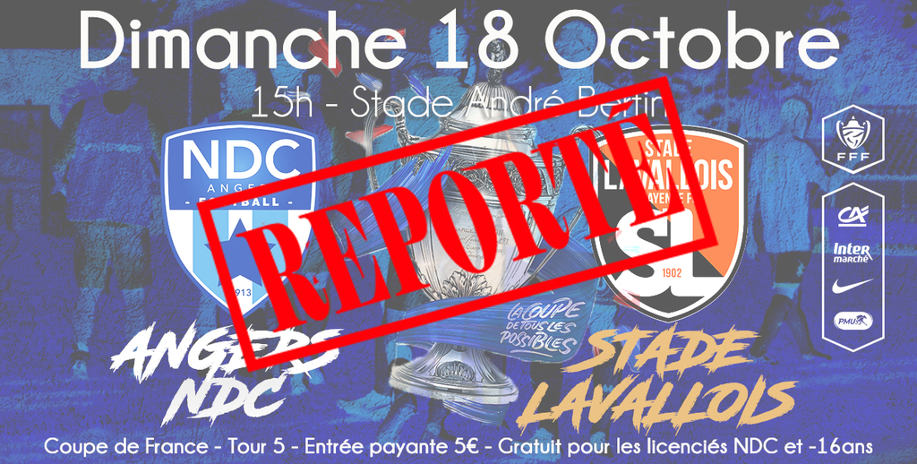 Ainsi, la rencontre du cinquième tour de la Coupe de France entre NDC Angers et le Stade Lavallois prévue le dimanche 1er novembre 2020 à 15 h au stade André-Bertin est reportée à une date ultérieure dont nous n'avons pas connaissance à ce jour.
