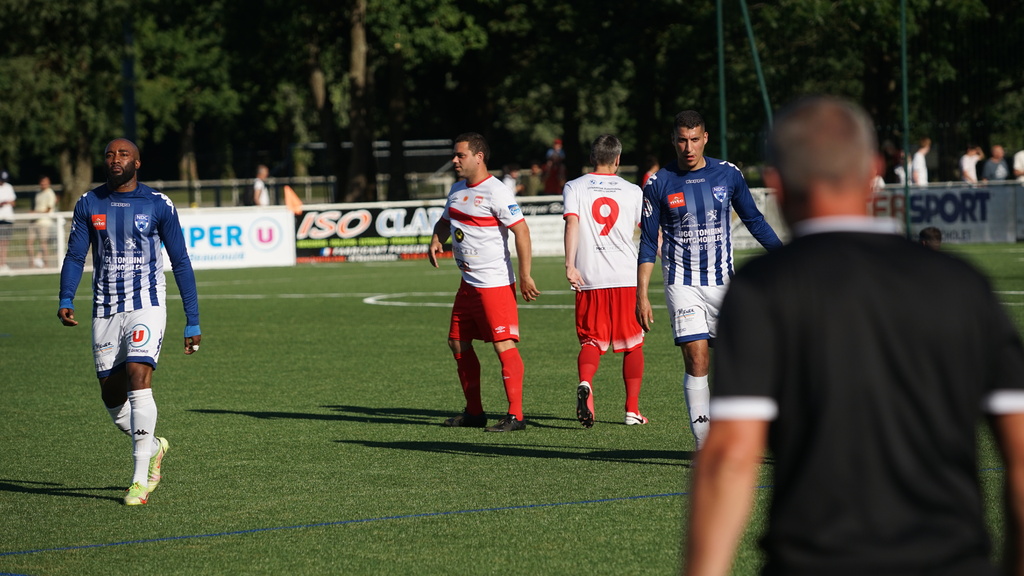 Sous la chaleur angevine il n'aura pas fallu longtemps aux Beaucouzéens pour trouver le chemin des filets. Les locaux concrétisaient leur deux premières occasions en passant par la gauche et faisait le break avant le premier quart d'heure (2-0, 12e). NDC mettait de plus en plus d'intensité et se créait des opportunités sans pour autant être dangereux. Avant la pause, les joueurs de Pierre Naudet donnaient tout pour revenir au score. Geoffroy Levron se créaient deux grosses occasions, d'abord un lob qui trouvait la barre (31e), puis un face à face qui passait à côté (35e). Le match montait en intensité et le défenseur latéral droit de Beaucouzé écopait de deux avertissements en dix minutes et laissait les siens à 10. A la pause, les Bleus étaient menés mais revenaient bien dans le jeu.