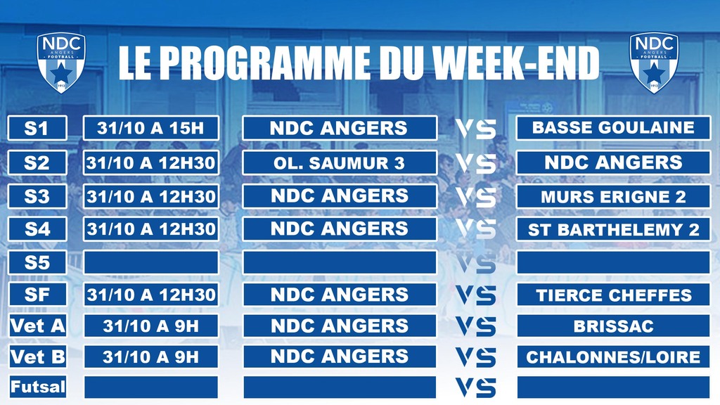 Nos vétérans ouvriront le bal dès 9h avec les réceptions de Brissac et Chalonnes sur Loire. Ils seront suivis par nos seniors B, C, D et féminines. Sur les synthétiques de Bertin la D2 et la D4 recevront respectivement Murs-Erigné 2 et St Barthélémy 2, alors que nos seniors féminines seront délocalisées sur le terrain de Marcel Nauleau pour accueillir Tiercé Cheffes. Seule équipe à l'extérieur du week-end, la réserve se déplace sur le terrain de l'Olympique Saumur 3.