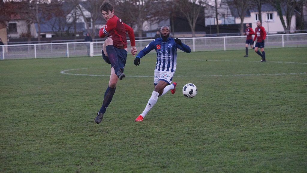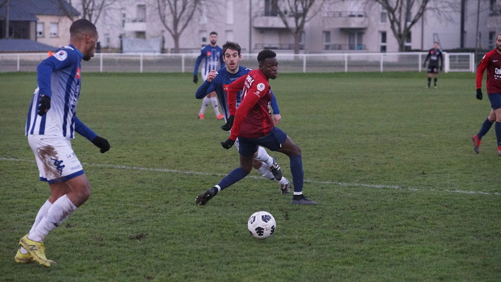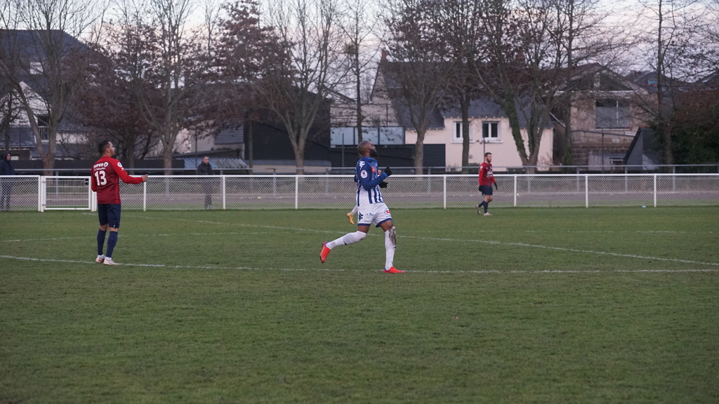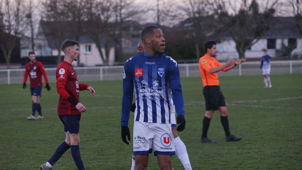 Après avoir réussi son entame de match les Angevins voyaient leurs efforts récompensés à la 25e minute. Sur un corner bien tiré par Alexis Louvel, Geoffroy Levron au premier poteau coupait la trajectoire et ouvrait le score (1-0). Trois minutes plus tard, Abessamad Ougrirane était exclu. Malgré l’infériorité NDC maîtrisait son sujet et n’était pas inquiété. Une première période avec peu d’occasions mais une équipe angevine qui gérait bien son avance.