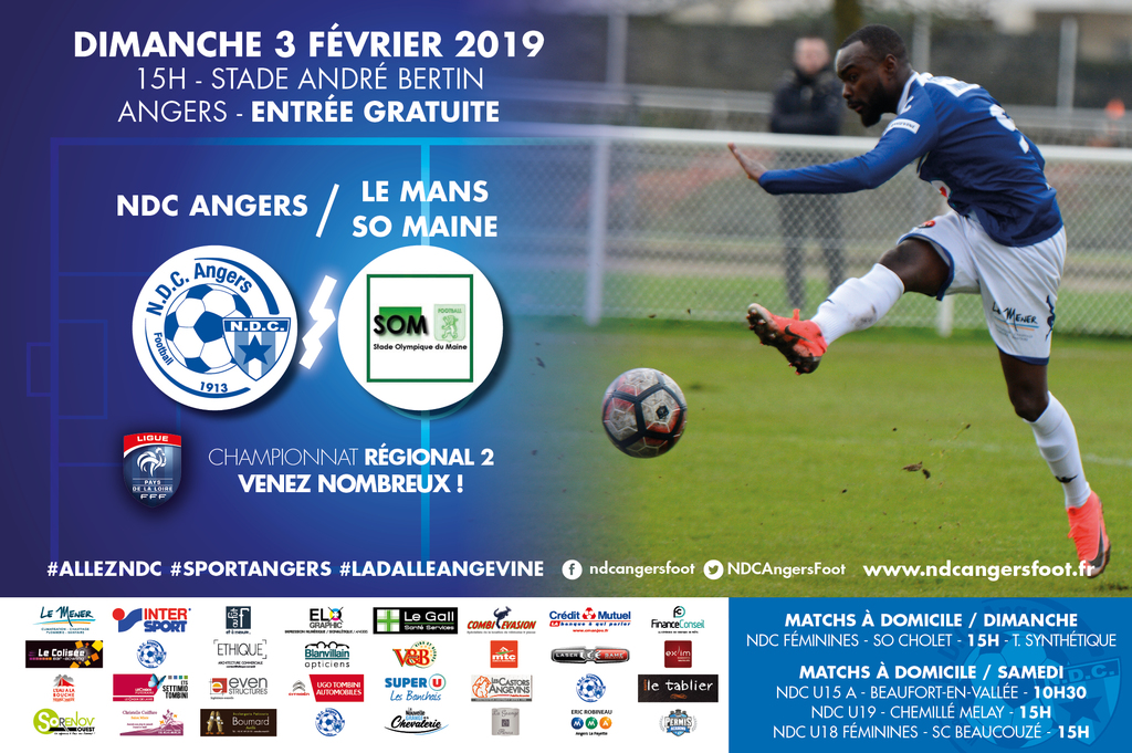 Les équipes de Régional 2 masculine et féminine sont toutes les deux à Bertin dimanche à 15 h : l'une face au SO Maine, l'autre contre le SO Cholet. Chez les jeunes, on peut retenir les deux affiches du samedi 15 h pour les U18 féminines et les U19. Affiche ce vendredi soir en futsal à Jean-Vilar : NDC se rend chez le leader.