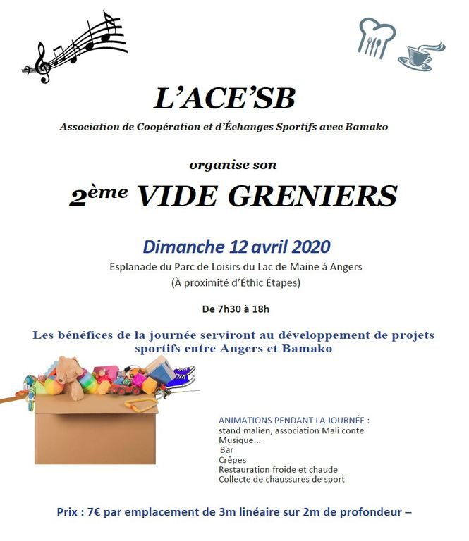 Dans le cadre du projet de coopération internationale avec le Mali, notre partenaire, l'Association de Coopération et d'Echanges Sportifs avec Bamako (ACE'SB) organise son traditionnel vide-greniers dimanche 12 avril au Lac de Maine. Inscrivez-vous vite !