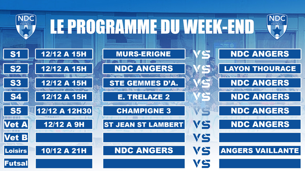 Du côté du foot à 11, nos U15 feront leur entrée en Challenge de l'Anjou samedi à 10h30 face à Pouancé. Plus tard dans la journée, nos U17 disputeront le premier tour de Coupe des Pays de la Loire face à Longué à 14h30.