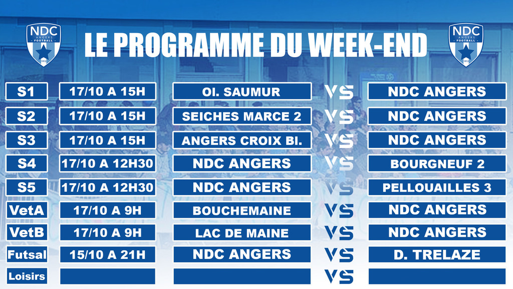 Les trois gros rendez-vous du week-end seront en Coupe de France. L'équipe fanion se déplacent sur le terrain de l'Ol. Saumur (N3) dimanche à 15h. Dans le même temps, nos féminines recevront le CS Changé (R1) pour leur 4e tour. L'équipe futsal démarre sa Coupe Nationale avec la réception d'une équipe R2, les Diabolos de Trélazé. Face à des adversaire hiérarchiquement supérieur, les équipes de NDC devront créer l'exploit pour continuer en coupe de France.