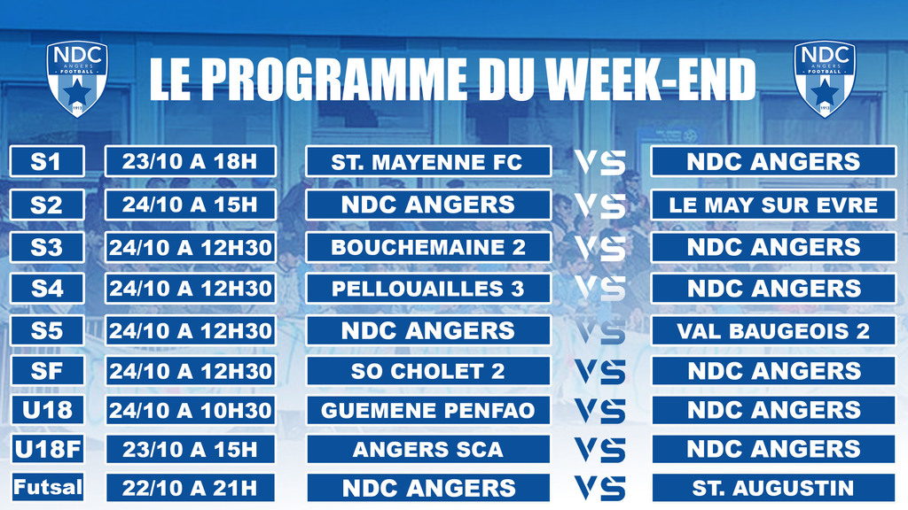 Du côté des seniors, trois équipes joueront à domicile ce week-end. Le futsal, ce vendredi à 21h, puis la réserve et la Départemental 5, respectivement dimanche à 15h et 12h30, animeront le complexe. Les équipes D2 et D4 se déplaceront sur les terrains de nos voisins de Bouchemaine 2 et Pellouailles Corzé 3.