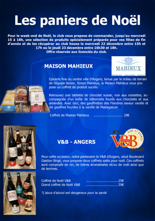Vous pouvez commander vos paniers par mail sur l'adresse suivante (paniers@ndcangersfoot.fr) ou lors des permanences club organisées mercredi 8 décembre de 15h à 17h et vendredi 10 décembre de 18h à 19h30.