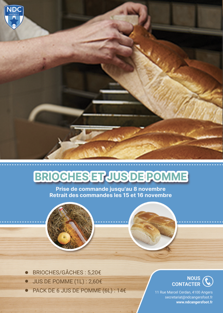 L’opération "Brioche et Jus de Pomme" est de retour ! Vous avez jusqu’au 8 novembre pour passer votre commande en ligne. Ne manquez pas cette occasion de déguster de délicieuses brioches et du jus de pomme artisanal tout en soutenant NDC Angers Football !